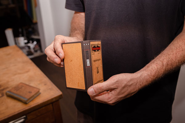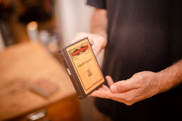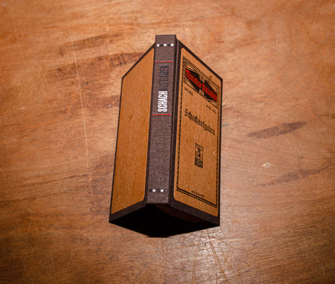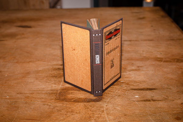Ein zerlesenes und oft gebrauchtes Schach-Buch brauchte dringend Hilfe. Herausgefallene Hefte, die Fadenheftung an mehreren Stellen zerrissen und eine Konstruktion (als Broschur), die nicht sehr wertig war. Kurzerhand habe ich das Objekt demontiert, Papierrisse geflickt und neu gebunden. Bei der neuen Buchdecke wurden die alten Umschlagblätter integriert und auf dem Buchrücken neue, passend zum Design gewählte Prägungen ausgeführt.